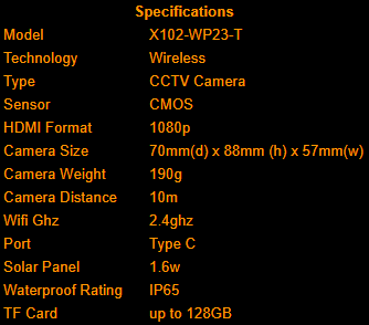 -Battery Camera -USB Charger -Screw Pack -Solar Panel -Camera Base Mount